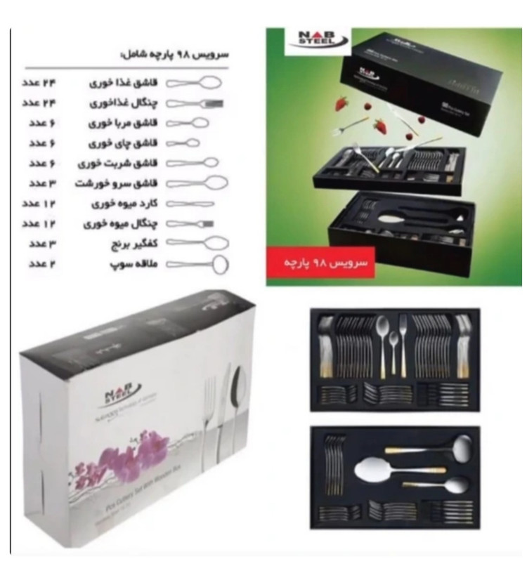 سرویس قاشق و چنگال 24 نفره ناب استیل طرح فلورانس 98 پارچه با طراحی مدرن برای مشتریان به روز ناب استیل تولید میگردد. اگر به دنبال قاشق و چنگالی میگردید که در عین سادگی لوکس نیز باشد، قاشق و چنگال مدل فلورانس ناب استیل انتخاب مناسبی است.دارای جعبه مقوایی کادویی