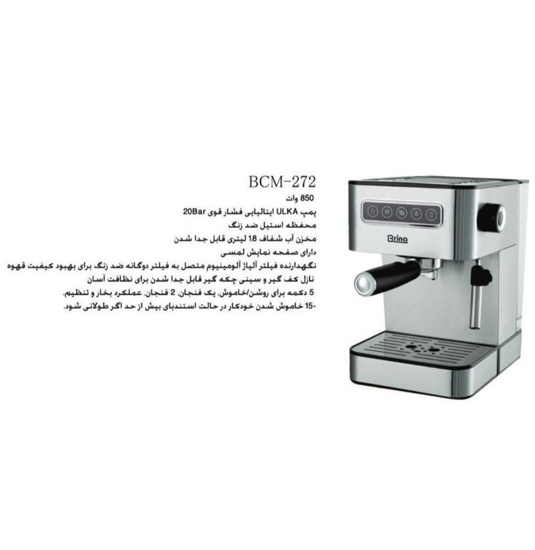 اسپرسو ساز برینا مدل BCM-272 یکی دیگر از محصولات برند محبوب وشناخته شده ی برینا می باشد که دارای فشار بخار 20 بار و توان مصرفی 850 وات می باشد که از این لحاظ دارای قدرت کافی برای عصاره گیری با کیفیت می باشد .اسپرسو ساز برینا مدل BCM-272 دارای یک پنل لمسی و زیبا می باشد که کار کردن با این دستگاه رو برای شما راحت تر و بسیار لذت بخش تر خواهد کرد …
